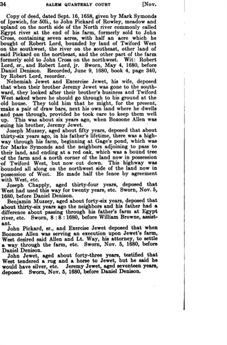 16 Sep 1658 – (Ipswich Deed IV : 340) . . . Marke SYMONDS of Ipswich . . . for . . . fifty pounds . . . Have Granted . . . unto John PICKARD of Rowley … his pcell of ground . . . lyeing on the North Syd of the North River … at the end of his farme formarly sold to John Crose containeing seaven acres . . . with about halfe an acre bought of Robert Lord . . . having the land of Twyford WEST toward the Southwest … . . . Rec. June 9, 1680.