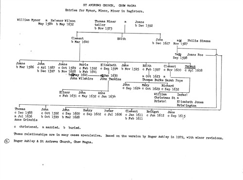 Clement Miner Sr – Family Tree – This is the most accurate information we have of Thomas Minor’s ancestry taken from the Registries of St. Andrew’s Church, Chew Magna, England. (First published in 1987).