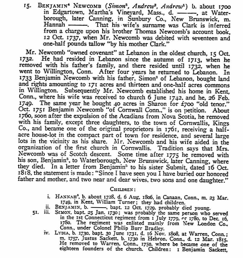 Benjamin Newcomb was born about 1700 in Edgartown, Martha’s Vineyard, Mass.  His parents were Simon NEWCOMB and Deborah LATHROP.  He married Hannah CLARK in 1727 in Canaan, CT.  After the final defeat of and expulsion of the Acadians, British control of the land was secured by repopulating the former French lands with settlers from the New England States.  Between 1760 and 1768 some 8000  New England “Planters” came to a new colony, see my post New England Planters in New Brunswick for their historical story.