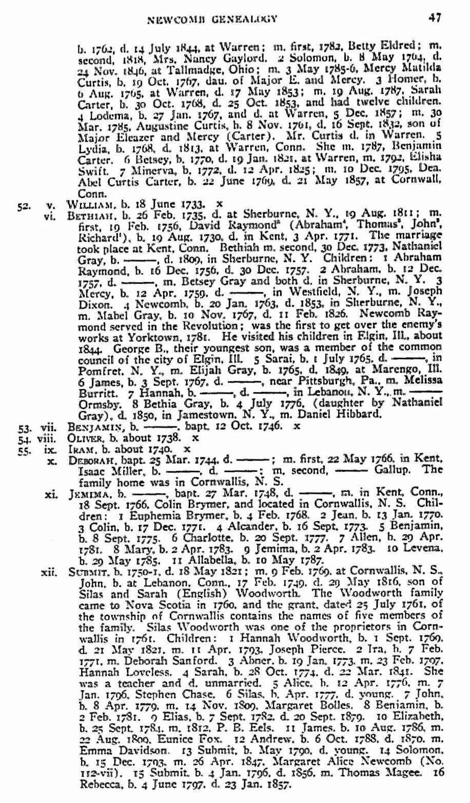 xiii. Solomon Woodworth b. 15 Dec 1793 in Cornwallis, Nova Scotia; d. 5 Dec 1883 Cornwallis, Kings, Nova Scotia; m. 26 Apr 1847 to Margaret Alice Newcomb (b. 22 Nov 1811 – d. 11 Dec 1864)