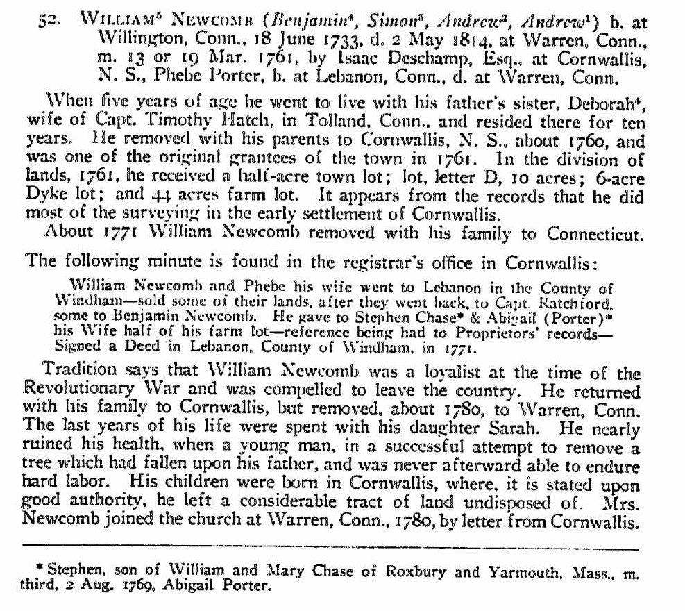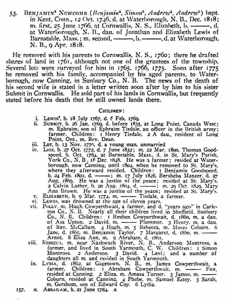 About 1760, soon after the expulsion of the Acadians from Nova Scotia, he removed with his family, except three daughters, to the town of Cornwallis, Kings Co., and become one of the original proprietors in 1761, receiving a half-acre house-lot in the compact part of town for residence, and several large lots in the vicinity as his share. Mr. Newcomb and his wife aided in the organization of the first church in Cornwallis. Tradition says that Mrs. Newcomb was of Scotch descent. Some time after 1775 he removed with his son, Benjamin, to Waterborough, New Brunswick, later Canning, where they died. In a letter from Benjamin to his sister Submit, dated 16 Oct 1818, the statement is made: “Since I have seen you I have buried our honored father and mother, and two near and dear wives, two sons and one daughter.”