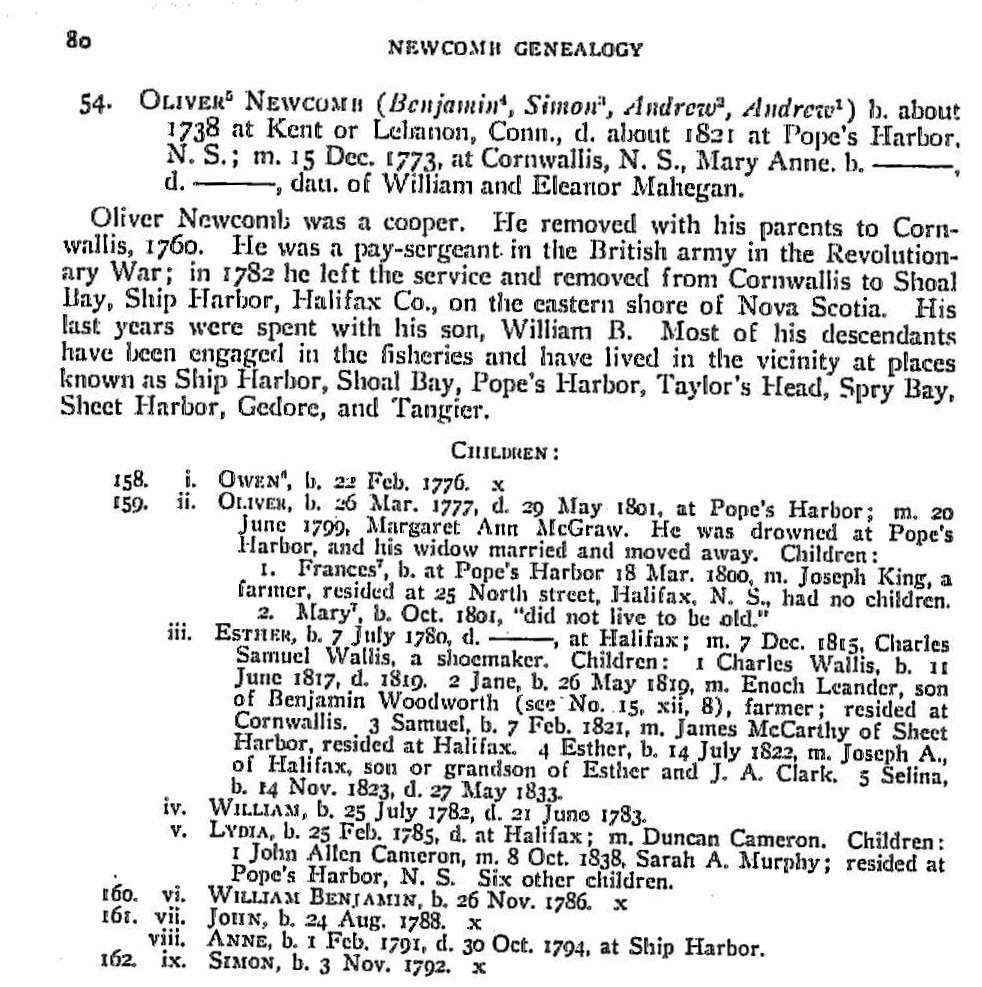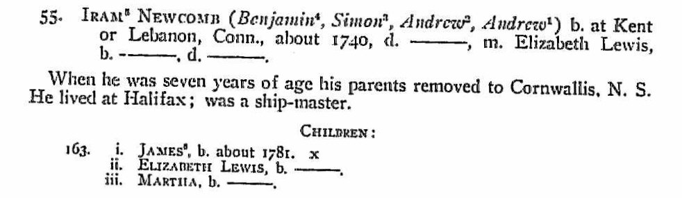 SMITH, LEONARD H., JR., and NORMA H. SMITH. Nova Scotia Immigrants to 1867. Baltimore: Genealogical Publishing Co., 1992. 546p.  Page: 186  – Name: Deborah Newcomb Year: 1760  Place: Nova Scotia, Canada Family Members: Son Benjamin; Daughter Deborah; Son Iram; Daughter Jemima; Son Oliver; Daughter Submit; Son William