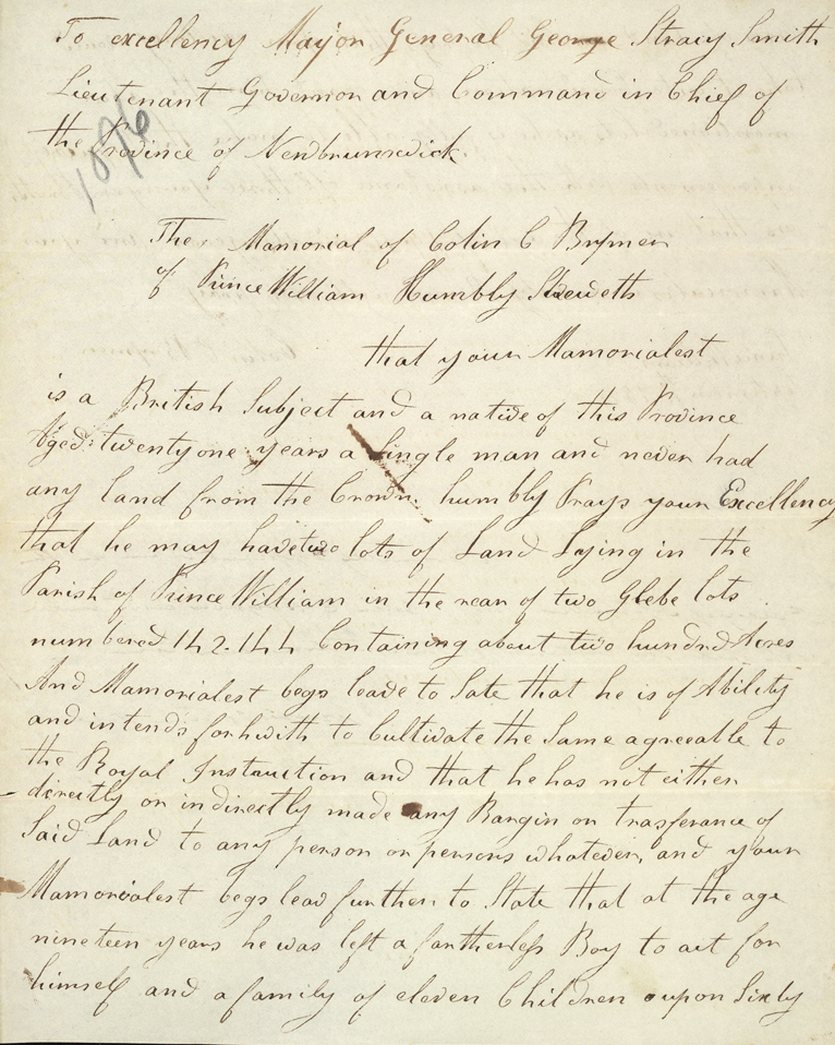 Humbly Sheweth that your Memorialest is a British Subject and a native of this Province Aged twenty one years a Single man and never had any Land from the Crown, humbly Prays your Excellency that he may have two lots of Land Lying in the Parish of Prince William in the rear of two Glebe lots numbered 142.144 Containing about two hundred Acres And Mamorialist begs leave to Sate that he is of Ability and intends forhwith to Cultivate the Same agreeable to the Royal Instruction and that he has not either directly or indirectly made any Bargin or transference of Said Land to any person or persons whatever, and your Mamorialest begs leav further, to State that at the age nineteen years he was left a fatherless Boy to act for himself and a family of eleven Children a upon Sixty