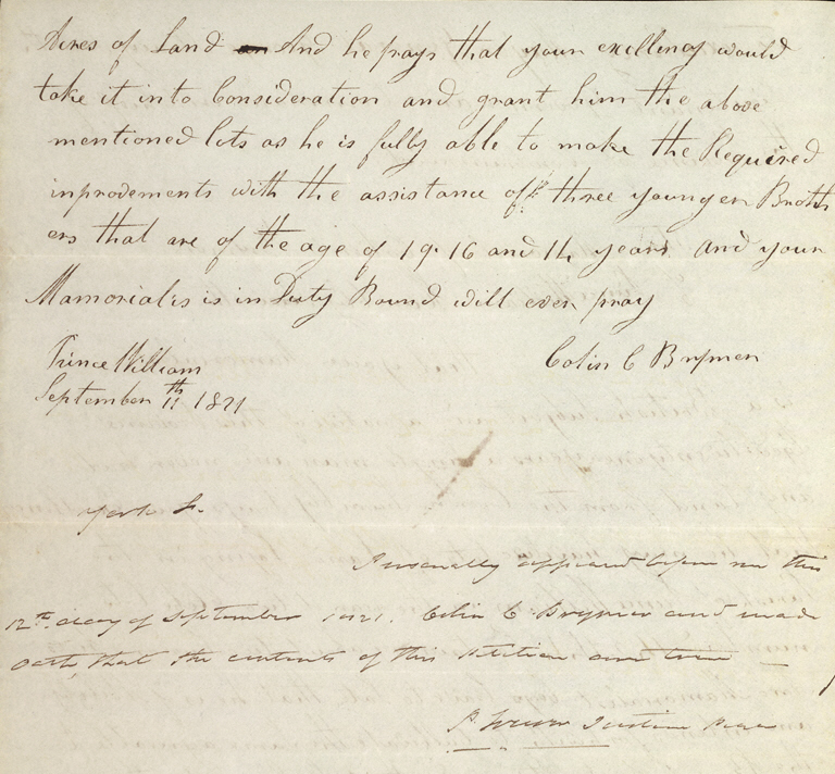 Petition on behalf of Colin Brymer, 11 September 1821, Prince William, “Black Loyalists in New Brunswick, 1783-1854,” Atlantic Canada Virtual Archives, digital image, document no. Brymer_Colin_1821_01, pp. 1, 4. RS 108: Index to Land Petitions: Original Series, 1783-1918