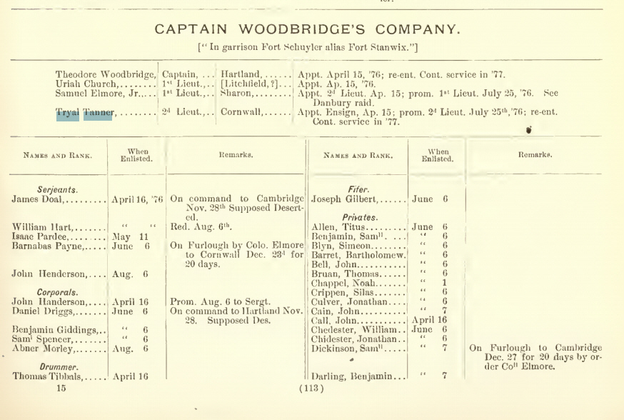 Tryal Tanner Muster 1 – Source: Record of service of Connecticut men in the I. War of the Revolution, II. War of 1812, III. Mexican War (1889) Author: Connecticut. Adjutant-General’s Office; Johnston, Henry Phelps, 1842-1923