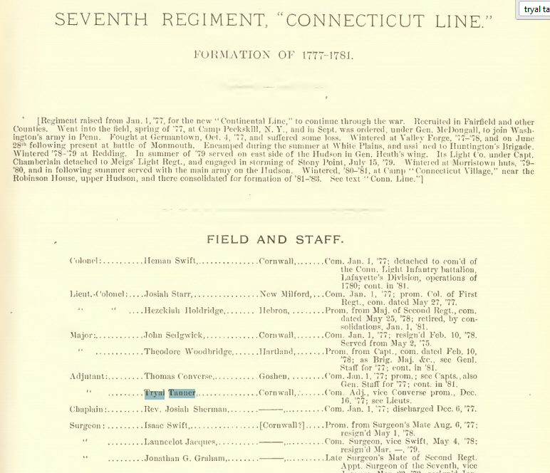Tryal was  Regimental Adjutant for the 7th Connecticut, a staff officer who assisted the commanding Col. Heman Swift in the details of regimental duty. The 7th Connecticut Regiment was raised on September 16, 1776 at New Milford, Connecticut. It saw action in 1777 in the Battle of Brandywine,  Battle of Germantown. It wintered at Valley Forge and saw action in 1778 at the Battle of Monmouth. The regiment was merged into the 5th Connecticut Regiment on January 1, 1781 at West Point, New York and disbanded on November 15, 1783.