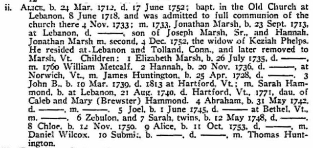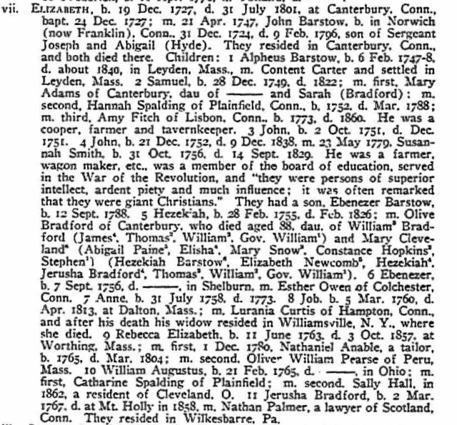 Elizabeth’s husband Ebenezer Wright was born 22 Feb 1701, at Lebanon, (Conn); His parents were Abel Wright and Rebecca [__?__]. Elizabeth bore him three children, and died 13 Jan 1727. He married second, 28 Mar 1728, Sarah Huntington, b. May 25, 1705, dau. of Joseph Huntington and Rebecca Adgate, and sister to Gov. Samuel Huntington (Wiki)’s father, by whom eight children, when she died Oct. 19, 1775. He married third, Feb. 13, 1776, Mrs. Mary (Mason) Huntington, the widow of David Huntington, a brother of his wife Sarah, with whom he lived ten years, and died April 22, 1786, at Mansfield, (Conn.), aged 85.
