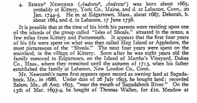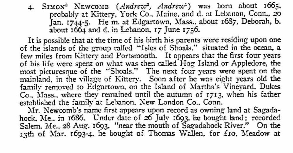 Simon Newcomb was born about 1665 in Kittery, York, Maine. His parents were Lt. Andrew NEWCOMB and Sarah YOUNG. When he was eight years old he moved with his father Andrew to Martha’s Vineyard, where he raised his children. He married Deborah LATHROP about 1687 in Martha’s Vineyard, Mass. In 1711 he made his first purchase off the Island, in Lebanon, Connecticut. and moved there permanently in 1714. Simon died 20 Jan 1744/45 in Lebanon, New London, Connecticut.
