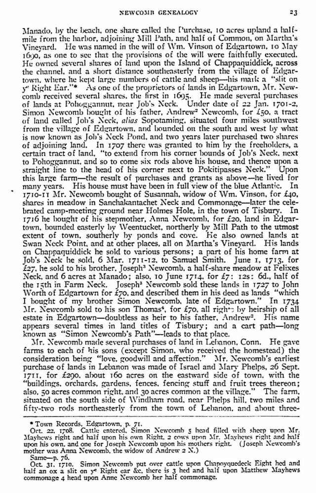 As one of the proprietors of lands in Edgartown, Mr. Newcomb received several shares, the first in 1695.