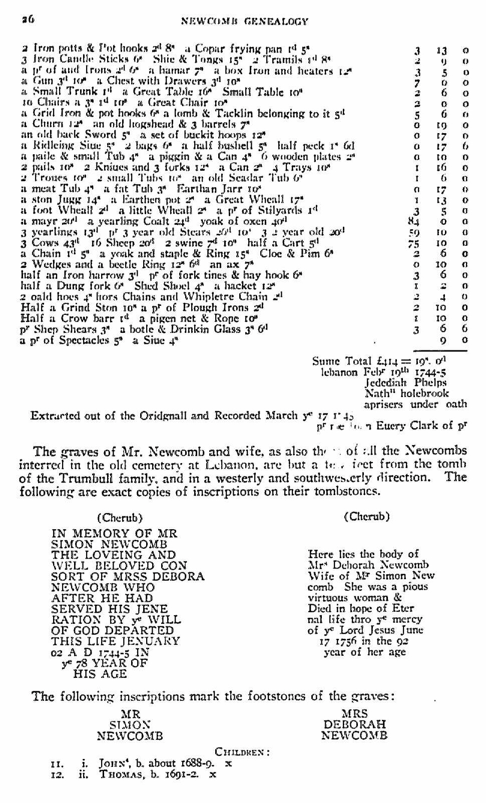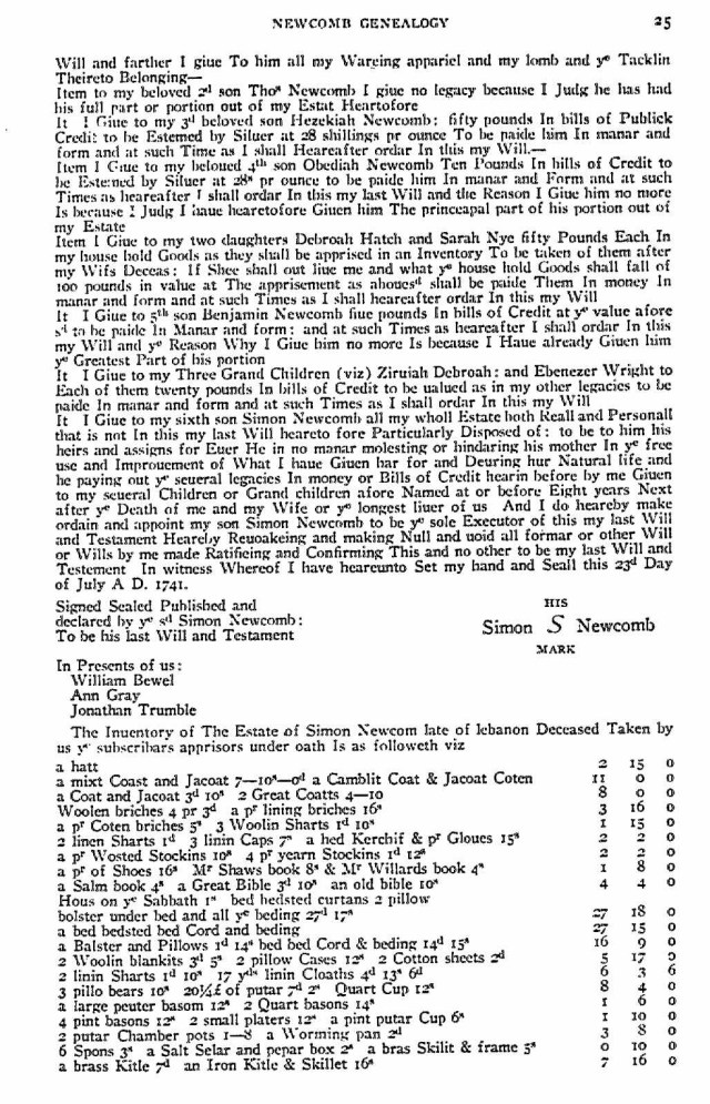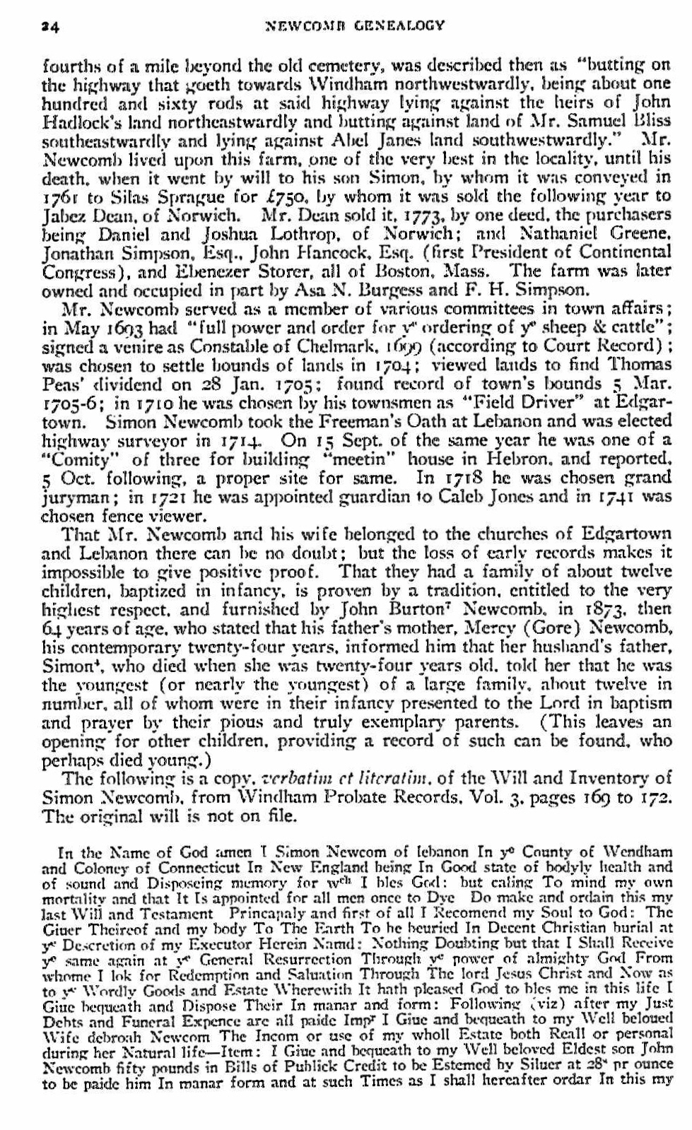 The following is a copy, verbatim et literatim., of the Will and Inventory of Simon Newcomb, from Windham Probate Records, Vol. 3, pages 169 to 172.