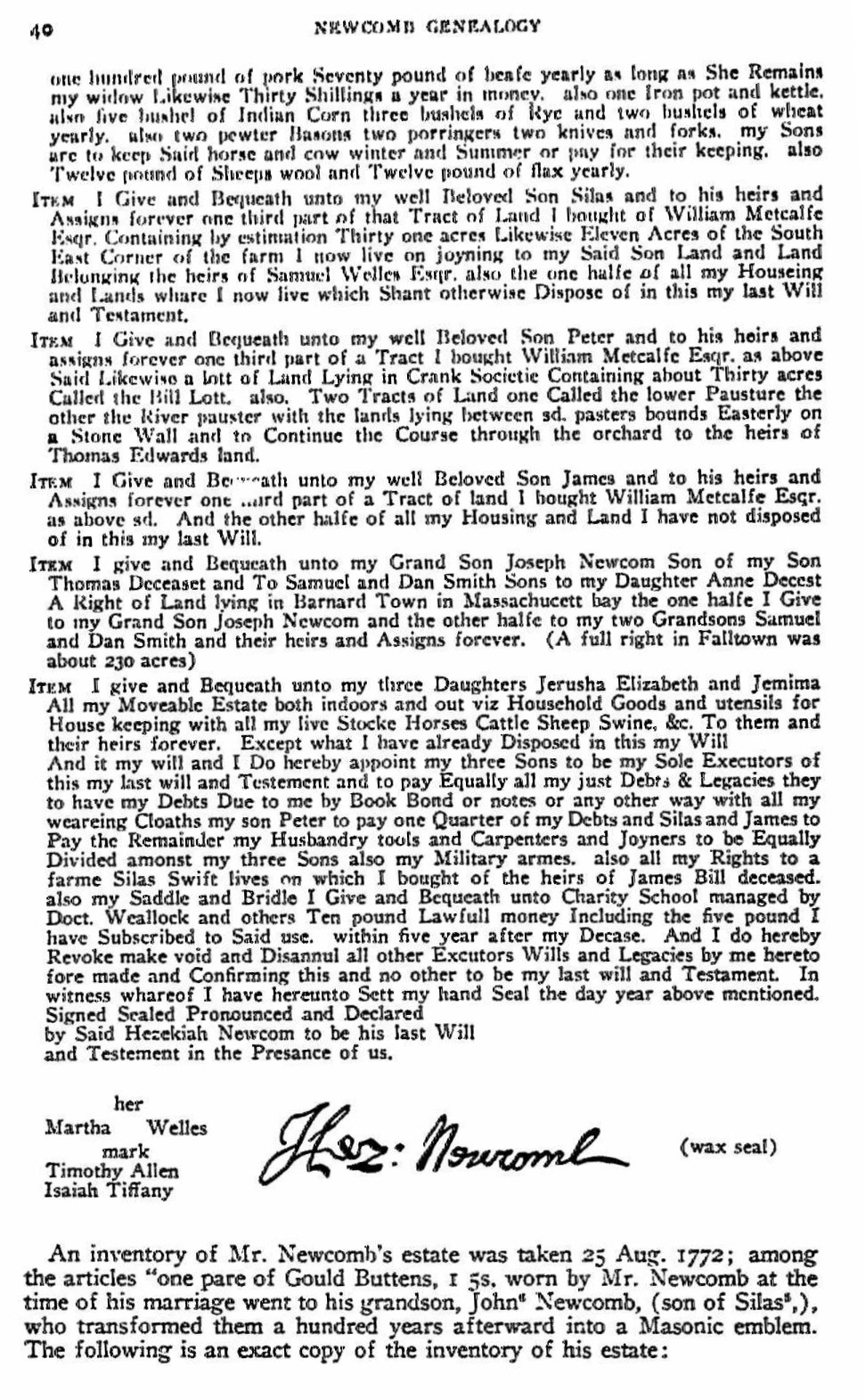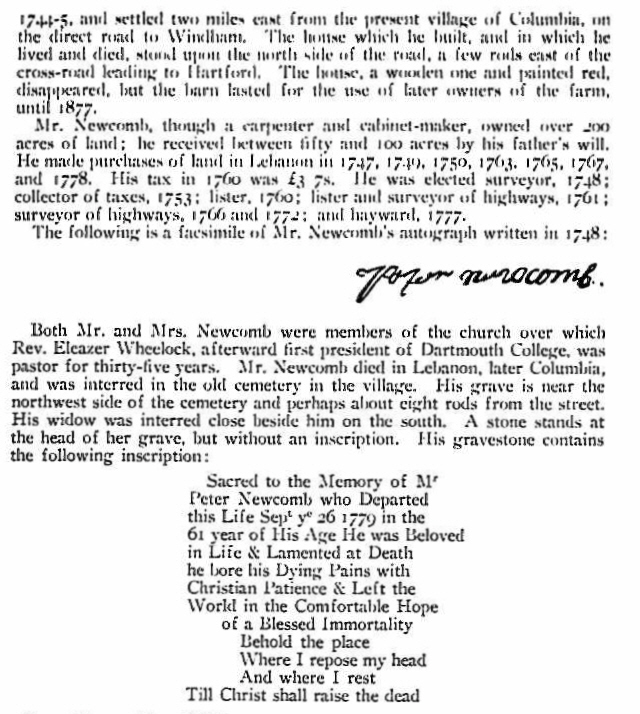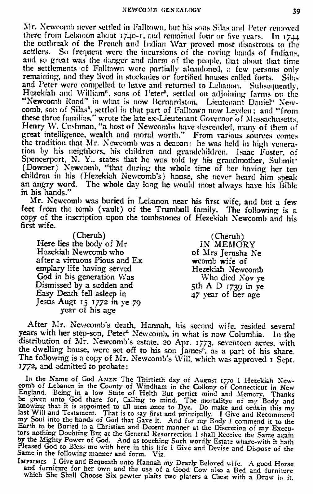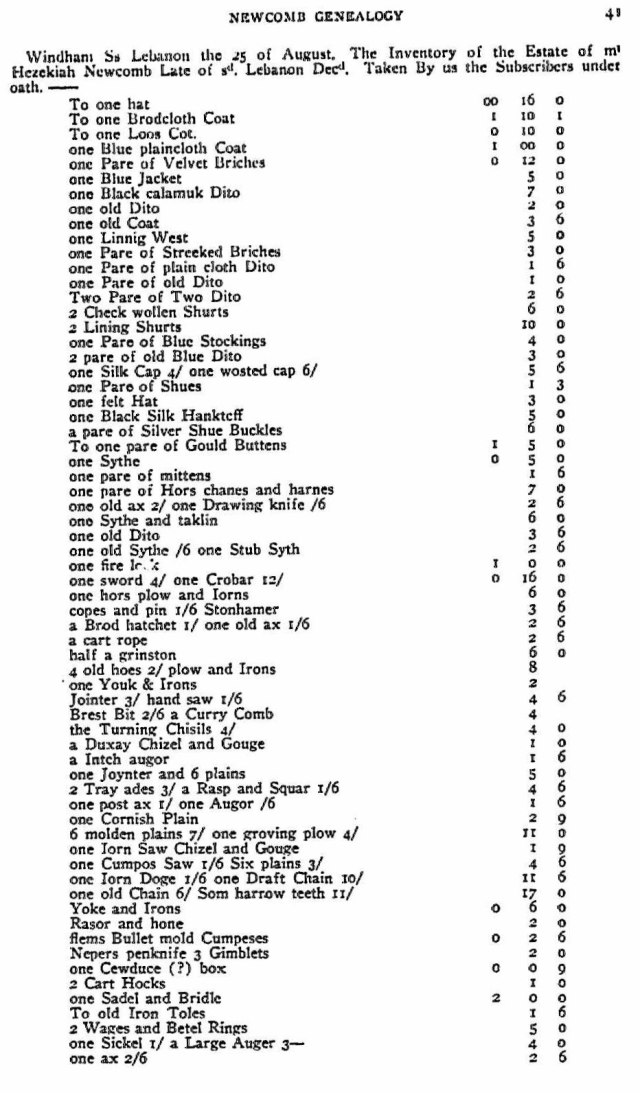 The following is a copy, verbatim et literatim., of the Will and Inventory of Simon Newcomb, from Windham Probate Records, Vol. 3, pages 169 to 172.