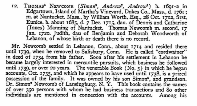 | 2. | Thomas Newcomb | 1691 Edgartown | Eunice Manning 28 Oct 1712 Nantucket, Mass. . Judith Woodworth 17 Jan 1718/19 Lebanon, CT |
