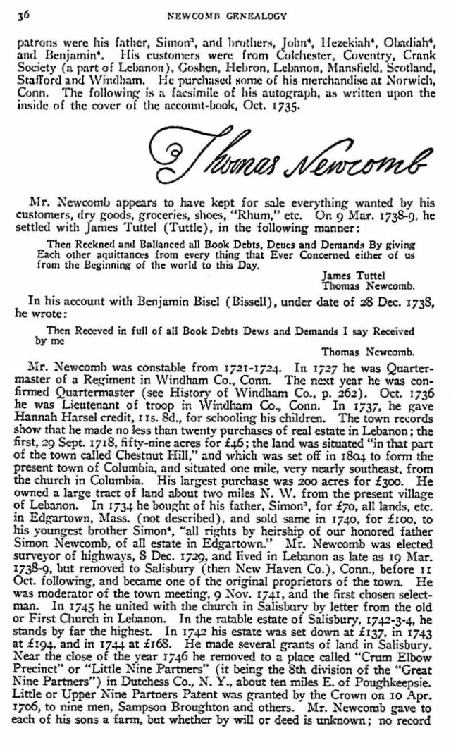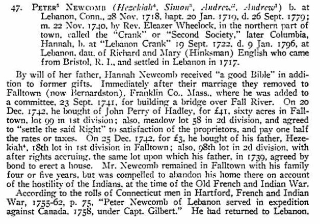 When, in 1755, under orders of the General Assembly a total force of 3000 men was raised in Connecticut, the payroll of Capt. John Terry’s Company, which marched from Lebanon 15 Sept., included “Simon Newcomb, master”, signing for Stephen. Harding Williams, Private, who served from Aug. 29 to Dec. 9, 1755. This signature seems to show that Williams was the bound servant of Simon Newcomb. Simon Newcomb served two weeks (as long as any) in Lieutenant-Colonel David Whitney’s company of militia for the relief of Fort William Henry, Aug. 1757. All of his company were Canaan men.