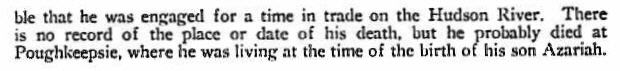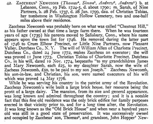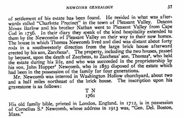 That Mr. Newcomb and his wife belonged to the churches of Edgartown and Lebanon there can be no doubt; but the loss of early records makes it impossible to give positive proof. That they had a family of about twelve children, baptized in infancy, is proven by tradition, entitled to the very highest respect, and furnished by John Burton Newcomb, in 1873, then 64 years of age, who stated that his father’s mother, Mercy (Gore) Newcomb, his contemporary twenty-four years, informed him that her husband’s father, Simon, who died when she was twenty-four years old, told her that he was the youngest (or nearly the youngest) of a large family, about twelve in number, all of whom were in their infancy presented to the Lord in baptism and prayer by their pious and truly exemplary parents. (This leaves an opening for other children, providing a record of such can be found, who perhaps died young.)