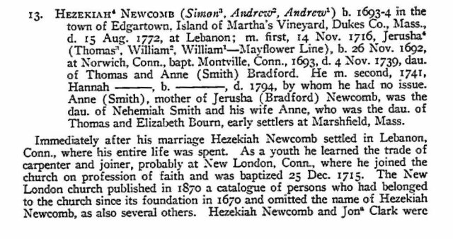 | 3. | Hezekiah Newcomb | 1693 Edgartown | Jerusha Bradford 14 Nov 1716 Norwich, New London, CT . Hannah Smith 1741 |