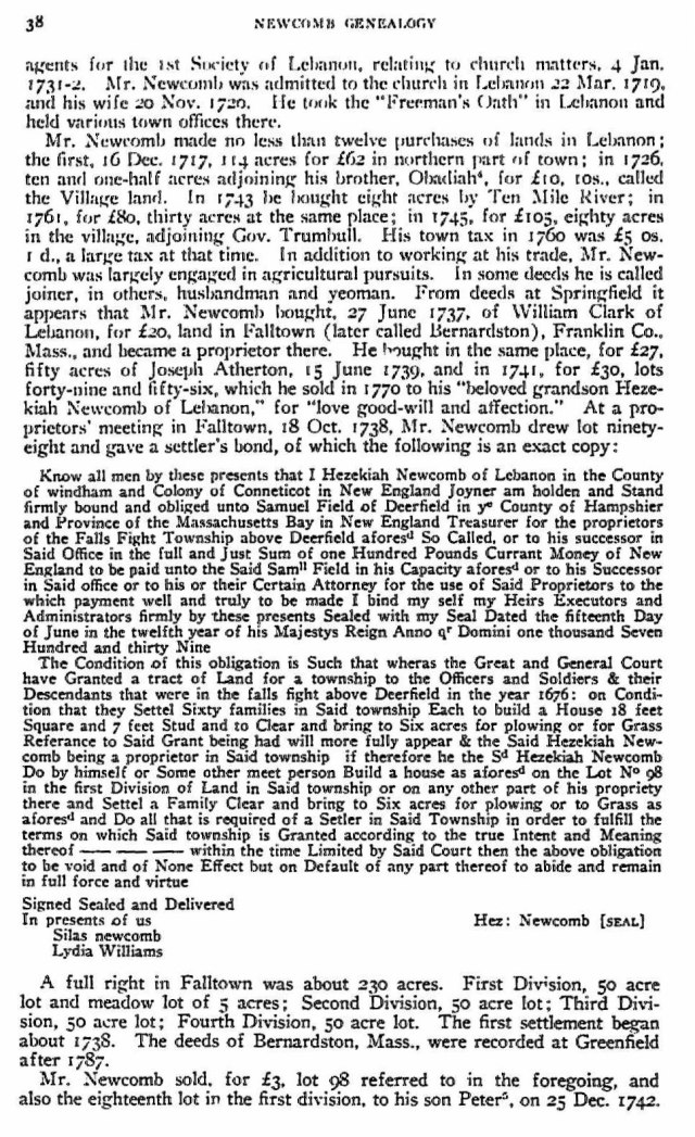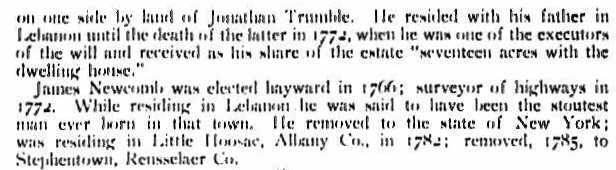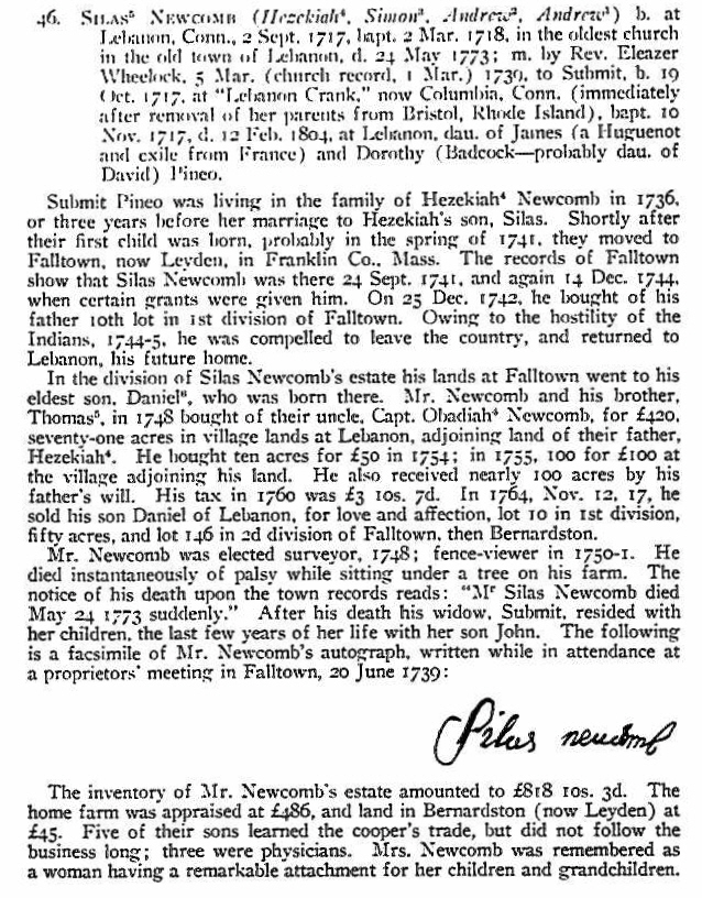 Mr. Newcomb made several purchases of land in Lebanon, Conn. He gave farms to each of his sons (except his youngest son Simon, who received the homestead), the consideration being “love, goodwill and affection”. Mr. Newcomb’s earliest purchase of lands in Lebanon was made of Israel and Mary Phelps, 26 Sept. 1711, for £290, about 160 acres on the eastward side of town, with the “buildings, orchards, gardens, fences, fencing stuff and fruit trees thereon; also, 50 acres common right, and 30 acres common at the village”. The farm, situated on the south side of Windham road, near Phelps Hill, two miles and fifty-two rods northeasterly from the town of Lebanon, and about three-fourths of a mile beyond the old cemetery, was described then as “butting on the highway that goeth towards Windham northwestwardly, being about one hundred and sixty rods at said highway lying against the heirs of John Hadlock’s land northwestwardly and butting against land of Mr. Samuel Bliss southeastwardly and lying against Able Janes land southwestwardly.”