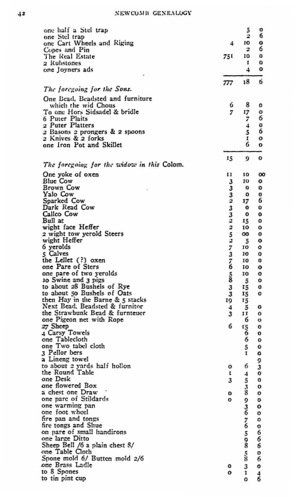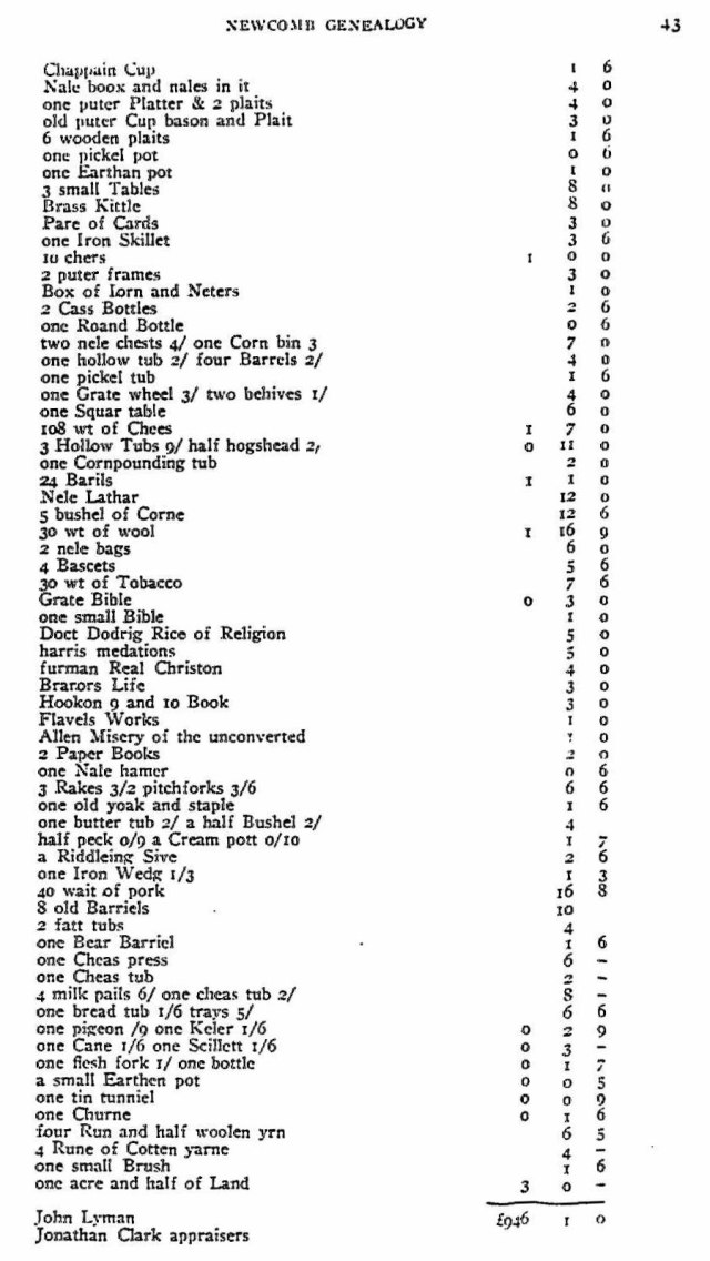 I Giue hequeath and Dispose Their In manar and form: Following (viz) after my Just Debts and Funeral Expence are all paide Imp I Glue and bequeath to my Well beloued wife debrah Newcom The Incom or use of my wholl Estate both Reall or personal during her Natural life—Item: I Giue and bequeath to my Well beloved Eldest son John Newcomb fifty pounds in Bills of Publick Credit to be Estemed by Siluer at 28s pr ounce to be paide him In manar form and at such Times as I shall hereafter ordar In this my Will and farther I glue To him all my Wareing appariel and my lomb and ye Tacklin Theireto Belonging–