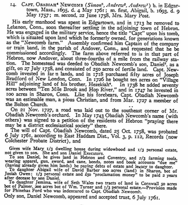 | 4. | Capt. Obadiah Newcomb | 1695 Edgartown | Abigail Curtis . Mrs. Mary Post 22 Jun 1758 Hebron, CT . Elizabeth May |