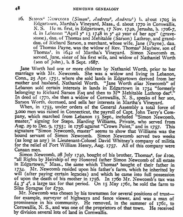 a. Simon Lathrop Newcomb b. 9 Jun 1769 in Ft. Cumberland, Nova Scotia; d. Sep 1846 in Wallace, Cumberland, Nova Scotia; m. 1798 to Jane Harris Pictou, Nova Scotia, Canada