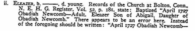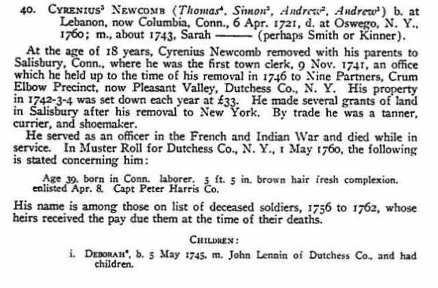 iii. Deborah Newcomb (twin) b. 28 Dec 1745 in Lebanon, New London, CT; d. 9 Mar 1751 Lebanon, New London, CT