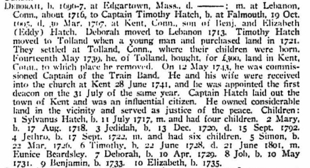 Deborah LATHROP was born about 1664 in Edgartown, Mass. Her parents may have been Samuel LATHROP and Elizabeth SCUDDER. However, many Lathrop genealogies don’t include their daughter Deborah. All of Deborah’s Lathrop siblings were born in Connecticut, while Deborah was supposed to be born in Martha’s Vineyard. Simon did have property in Lebanon, CT. Some genealogies state that her parents were Samuel William Buell and Deborah Griswold. However, their Deborah Beuell married Nathaniel Porter in 1710 in Killingworth, CT. Our Deborah died on 17 Jul 1756 in Lebanon, CT.