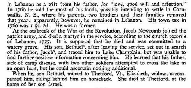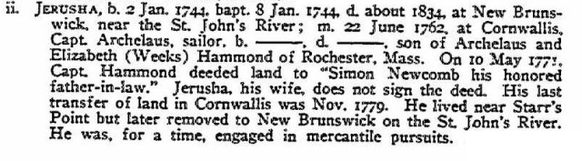 ii. Jerusha Newcomb b. 2 Jan 1744 in Lebanon, New London, CT; d. 1834 New Brunswick; m. 1762 in the first marriage of the Planters recorded in Kings County Nova Scotia to neighbor Capt. Archelaus Hammond (b. 1736 in Fairhaven, Mass. – d. 1805) Archelaus’s parents were Archelaus Hammond Sr. and Elizabeth Weeks. Jerusha and Archelaus had five children born between 1762 and 1771.