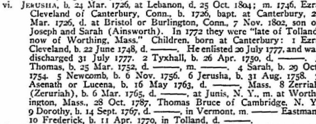i. Zerviah Wright b. 12 Mar 1722 in Windham, CT; d. 1768; m. 8 Jan 1741 in Windham, CT to John Upton (b. 27 Apr 1717 in Reading, Mass.)