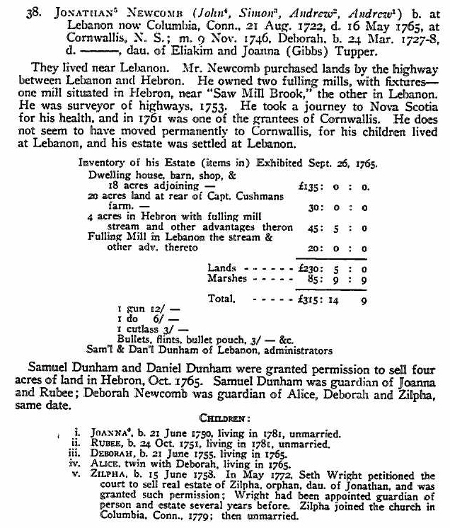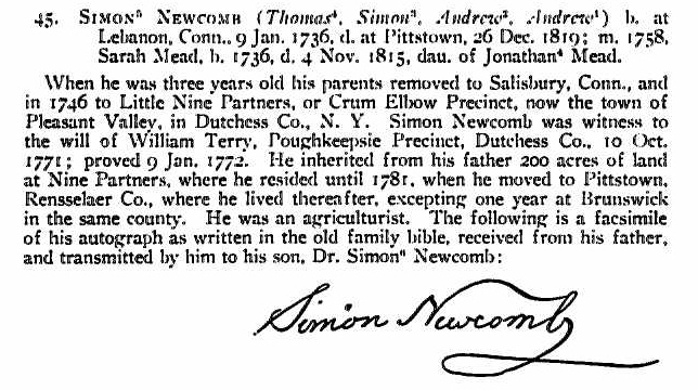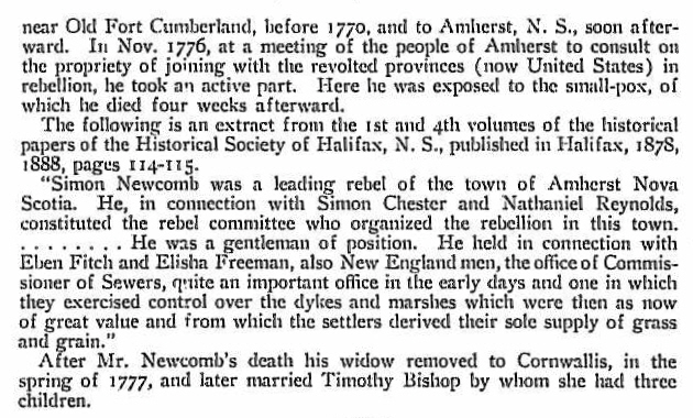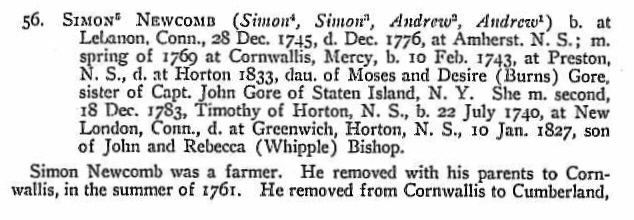 iv. Simon Newcomb (twin) b. 28 Dec 1745 in Lebanon, CT; d. Dec 1776 – Amherst, Cumberland, Nova Scotia of smallpox; m. Mercy Gore (1743 – 1833). Mercy’s parents were Moses Gore and Desire Burns. Simon immigrated with his parents and later moved from Cornwallis to Amherst. From this line comes Simon Newcomb, Professor of Mathematics and Astronomy in the United States After Simon died, Mercy married 18 Dec 1783 Horton Nova Scotia to Timothy Bishop (b. 22 Jul 1740 New London, CT – d. Greenwich, Horton, Nova Scotia)