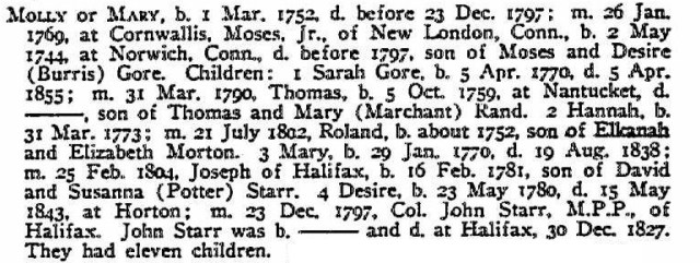 vi. Mary “Molly” Newcomb b. 1 Mar 1752 in Lebanon, New London, CT; d. 3 Dec 1797 Nova Scotia; m. 26 Jan 1769 in Cornwallis, Kings, Nova Scotia, Canada to Moses Gore (b. 2 May 1744 in Norwich, New London, CT – d. 1797) Moses’ parents were Moses Gore Sr. and Desire Burris. Mary and Moses had five children born between 1770 and 1782.