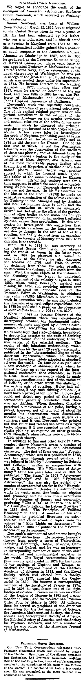 aaa. Simon Newcomb (wiki) (1835 – 1909) was a Canadian-American astronomer and mathematician. Though he had little conventional schooling, he made important contributions to timekeeping as well as writing on economics and statistics and authoring a science fiction novel.
