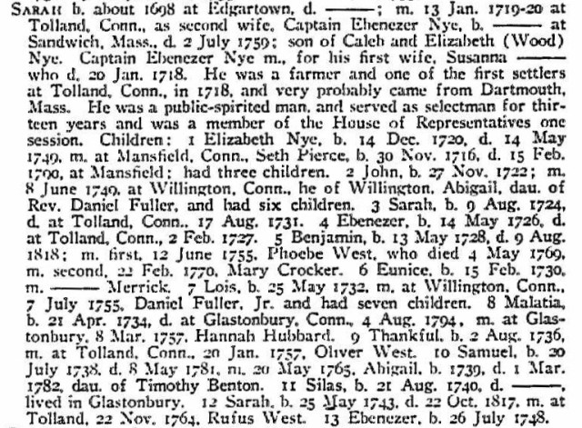 xi. Sarah Nye b. 25 May 1743 in Tolland, Tolland, CT; d. 22 Oct 1817 Tolland, Tolland, CT; m. 22 Nov 1764 in Tolland, Tolland, CT to Rufus West (b. 1 Oct 1735 in Tolland, Tolland, CT – d. 12 Aug 1814 in Tolland, Tolland, CT) Rufus’ parents were Joseph West and Joanna Delano.