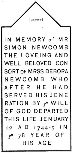 Deborah Newcomb Headstone Here lies ye body of Mrs Deborah Newcomb Wife of Simon Newcomb She was a pious virtuous woman & Died in hope of Eternal life thro ye mercy of ye Lord Jesus June ye 17 1756 in the 92 year of her age.