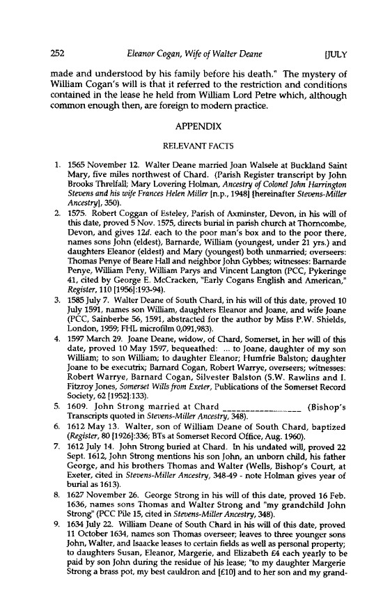 Mary Lovering Holman, Ancestry of Col. John H. Stevens…, (Concord, N.H., 1948), pp. 348-49, gives a verbatim excerpt from the will of this William Cogan, who may have been the Cogam witness of the William Deane will, above, and identifies Eleanor, the wife of Walter Deane, as a daughter of John Strong of Chard, Somerset, and sister of the John Strong of Northampton, Massachusetts. However, Mrs. Holman also shows the younger John Strong had for his first wife Margery Deane, the sister of Walter Deane, and thus the “beloved brother” relationship between Walter Deane and John Strong may be a “brother-in-law” relationship. No Eleanor appears in the will of the older John Strong. The will of William Cogan actually left his house and land “(after the death of my daughter Eleanor Deane wife of Walter Deane in New England) unto Eleanor Cogan my daughter and to the heires male of her bodie,” and for default of male issue to “Joane Cogan my daughter and to the heires males of her bodie,” and for default of male issue to Joane then to “the heires male of the said Eleanor Deane of her bodie.” This peculiar set of conditional inheritances suggests that Eleanor Deane had a lifetime interest in the house and lands, perhaps because she had been married earlier to William Cogan’s son, but without having male issue by him. If she had also been a cousin to William Cogan’s son (not a rare occurrence at the time), this could be a possible explanation as to why the sequence of inheritance would be first to her [p.280] for life, then to the male issue of two daughters of William Cogan in turn, and finally, if they had no male issue, then to the male issue of Eleanor Deane. It is significant that female issue are excluded, and the facts seem to indicate that Eleanor Deane was of the Cogan male line, but was not a blood daughter of William Cogan (even though he called her “daughter.” Since she had been a blood daughter, then the male issue of the other Eleanor Cogan and her sister Joane Cogan, would not have been intermediate in the line of succession between the lifetime possession by Eleanor Deane and the final conditional inheritance by her own male issue with any husband). It is an interesting problem that obviously requires more research.