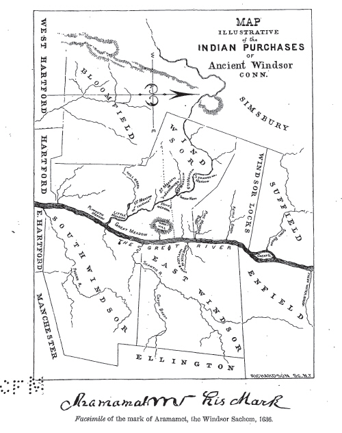 In a deed of confirmation given May 19, 1687, by his daughter, Quashabuck, widow of Coggerynosset of Poquonock, deceased, she testifies that “her father received full satisfaction therefor/’ and as she is his only child she makes over her right and title to Capt. Benjamin Newbury, Capt. Daniel Clark, Mr. Simon Wolcott, Mr. Henry Wolcott, and. Return Strong, as representatives of the town of Windsor. Aushqua, her son (by Coggerynosset), also confirms the same. This land is more fully described in the deed as “between Gunn’s Brook down to Connecticut River, which brook falls into the river at a place called New Brook [present Hay den’s Station], at upper end of land formerly William Hay den’s, deceased, and since to his son Daniel, and from the brook it runs north to the Stony Brook (which enters Connecticut River opposite the great island on the falls), and bounds easterly on the Connecticut River, and thence runs west to the westward side of the mountains, and continues all along the same breadth as at the east end.”