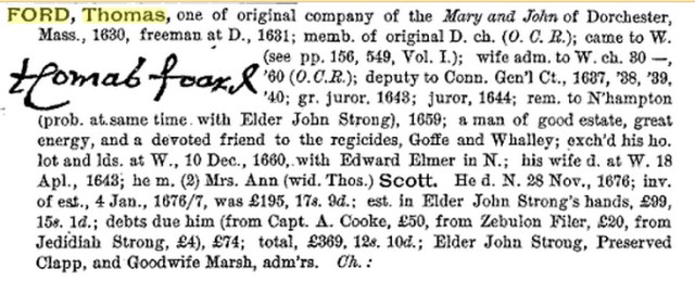 Thomas left no will, but the inventory of his estate taken January 4, 1676/77 showed property worth over £369. Administrators were his son-in-law John STRONG, grandson Preserved Clapp, and daughter Hepzibah (“good wife Marsh.”) Ford was called “a man of energy and influence who made his impress on posterity through three or four daughters’ of excellent worth”.
