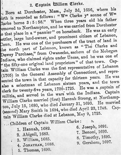 Capt. William Clark Sr. was born 3 July 1656 at Dorchester, Mass. His parents were Lt. William CLARK and Sarah STRONG.   He married Hannah STRONG, his second cousin on 15 Jul 1680 in Northampton, Mass.   After Hannah died, he married Mary Smith on 31 Jan 1694/95 in Lebanon, New London, CT.  William died 9 May 1725 in Lebanon, CT.