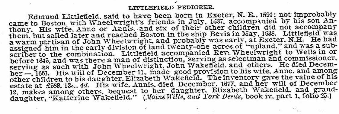 LITTLEFIELD, LITTLEFEILD, LETLEFEILD, Edmund, Exeter, signed the combination 5 (4) 1639. His wife Annis, ae, 38, with 6 children, and servants John Knight, and Hugh Durdal, came in theBevis in May 1638. It may be presumed that he either came at that time, (though not named on the passenger list) or had come before. He rem. to Wells, Me; had a grant of land from Thomas Gorges 14 July 1643. Took oath of allegiance to Mass. govt. 5 July 1653, as did his sons Francis Senior, Anthony, Francis Junior, and Thomas.