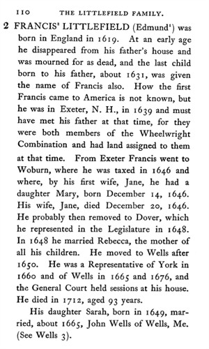 “Edmond Littlefield came from Titchfield, ENG in 1637, settled at Exeter, NH and later moved to Wells, ME. He was one of the original settlers at Wells and probably built the first house there. In 1641 he built a saw and grist mill on the Webhannet River. He was agent of Thomas Gorges to give possession of house lots to settlers, and was one of the committee for settling the boundary between Wells and Cape Porpoise, and a commissioner to try small causes from 1654 to 1661. On Dec. 11, 1661, he made his will at Wells, ME. He named his wife, Annis and sons Thomas and Francis extrs. HE HAD TWO SONS NAMED FRANCIS, BOTH LIVING. Francis and Anthony came with their father in 1637.”