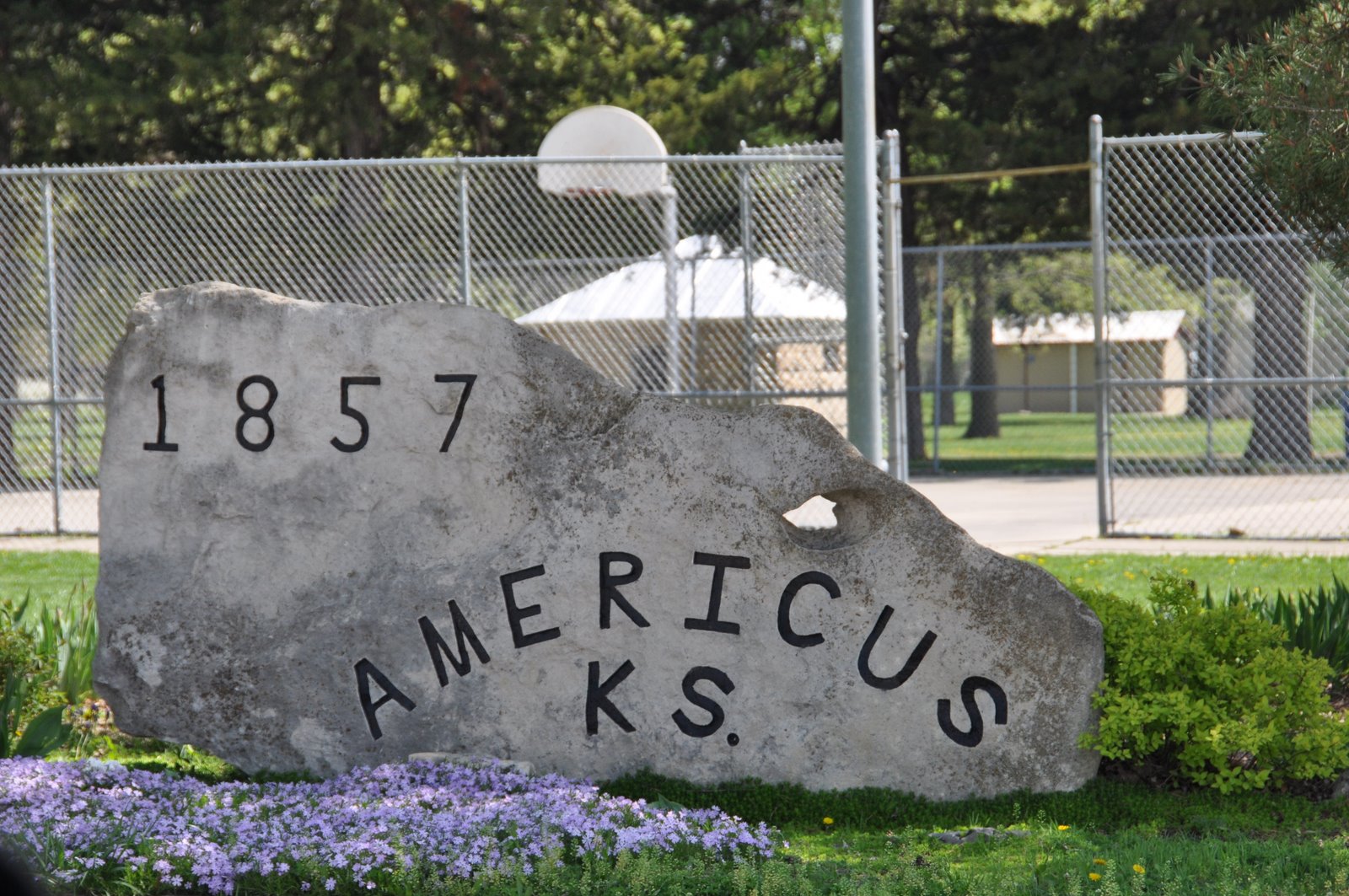 In the fall of 1857, a company known as the Americus Town Company, was formed for the purpose of locating a town, destined to be the future county-seat. The company was composed of the following members, none of whom are living in Americus today: T. C. Hill, G. H. Rees, E. Yeakley, J. Moser, E. Columbia, William Grimsley, E. M. Sewell, B. Wright, N. B. Swister, A. I. Baker, J. W. Voak, J. Voak, W. Thompson, D. Swim, F. Barrett and E. Goddard. The first officers were: A. I. Baker, Pres.; T. C. Hill, Treas.; D. Swim, Sec’y. A town site of 640 acres was laid off, and improvements made. The first building was a one-story structure, built of native lumber by E. Yeakley, and was occupied as a dwelling. The next building was erected by W. Thompson, and is a two story frame. It was opened as the “Americus” House, July 4, 1858, with a grand  ball. The building is still standing and is now known as the Sulton House. About the time the hotel was completed, G. H. Page built a small building near the site of the present depot and opened a store. In the summer of 1858, a log building, built by subscription, was completed and in it was held the first school. In 1859, a church building was built by popular subscription and used by all denominations until other edifices were built.