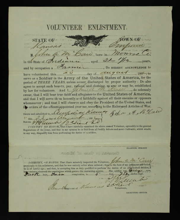 Our John was born in Scotland or Ireland in about 1825. He came to America in 1846 (do not know which port). He married Anna Smith in 1853. (She was born in Canada). Williams wife was also a Smith. Our John and family also traveled to Indiana (LaPort) then went to Chetopa, Ks. in 1869. William arrived in Chetopa in April 1879 and passed away there as did our John in 1895. John Addison and Emma McCaw also lived in the Chetopa area. My grandfather was John A. McCaw, my father was Clyde McCaw. John and Emma lost a baby in Aug.1883. The baby’s name was Clyde Henry. There may not be any connections of these family’s but thought it might be worth a try. We have hit a brick wall with our John. If you are interested I do have the army records for your John A.. I sent for them thinking they were for our John A. I hope that I have explained this clearly. I would greatly appreciated hearing from you.
