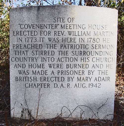 When the Revolutionary war broke out, Rev. Martin was a strong supporter of the patriots. In 1780 he preached another of his fiery sermons, reminding the congregation of the hardships that their fathers had suffered, that they had been forced out of Scotland and again out of Ireland, had come to America where they were free men and where they had built their homes and church. Now the British were coming and would once again drive them from their homes. He told them that there is a time to pray and a time to fight and the time to fight had come. Immediately after the sermon, two companies were formed under command of Ben Land and Captain Barbour. The next day they joined the American forces fighting the British. For his efforts, the British burned the church and took Rev. Martin prisoner.