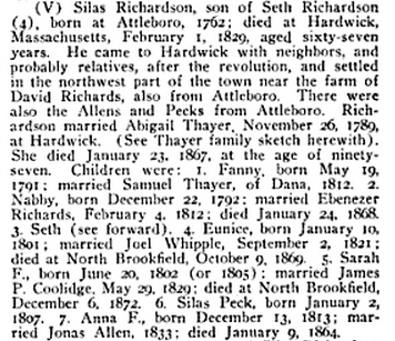 i. Olive Balcom b: 29 Jul 1787 in  Attleboro, Bristol, Massachusetts; d. 17 Oct 1820 in Attleboro, Bristol, Mass.. m. 5 Feb 1812 Attleboro to Silas Richardson (b. 2 Apr 1791 Attleboro – 16 Jul 1878 Winslow, Kennebec, Maine) Silas’ parents were our ancestors Seth RICHARDSON II and Sarah FRENCH.  After Olive died, Silas married twice more, 3 Jun 1821 Attleboro to Ruth Cutting and 17 Apr 1854 Winslow, Maine to Mary Daggety.