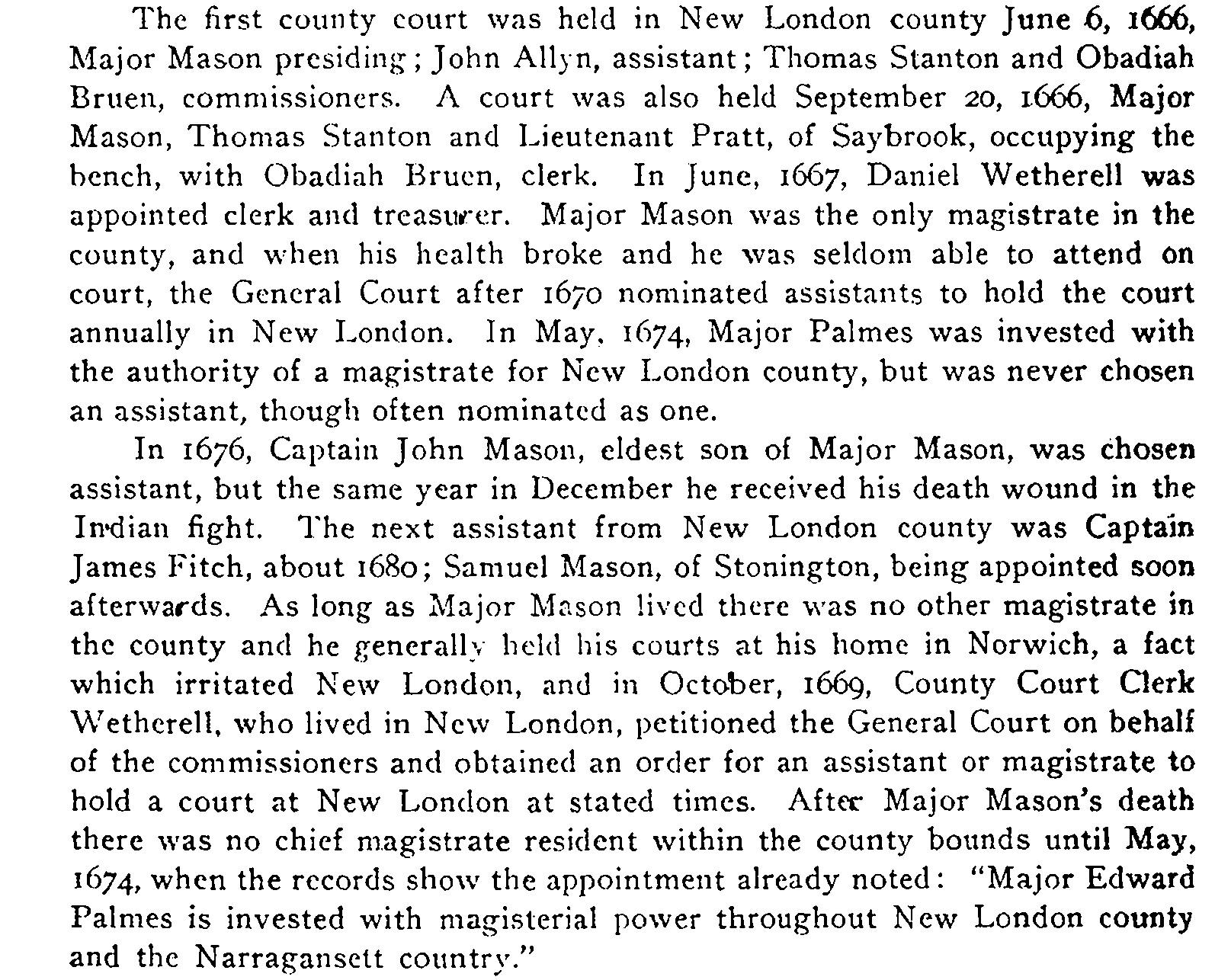 John Mason was one of the most trusted men in Connecticut during his three and a half decades of residence there, in both civil and military matters. In his latter years the formal colony records referred to him simply as “the Major,” without forename or surname. Only a sampling of his activities can be presented here.