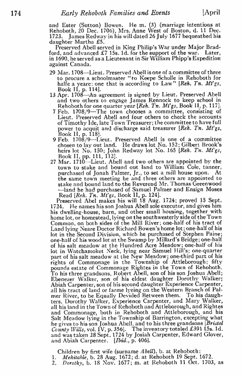 viii. Experience Abell b. 10 MAR 1692/93 Rehoboth, Mass.; m. 1 Jan 1717/18 Rehoboth, Mass. to Abiah Carpenter.