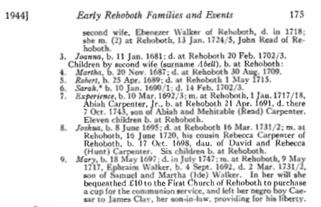 x. Mary Abell b. 18 MAY 1697 Rehoboth, Mass.; d. 22 JUL 1747 Rehoboth, Mass.; m. 9 May 1717 Rehoboth, Mass to Ephraim Walker