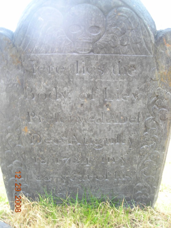 ABIGAIL SLUMAN: Grave inscription: “Here lies the body of Abigail Abel, wife of Mr. Caleb Abel, a prudent and virtuous woman, who after short illness departed this life in hope of life eternal, Nov. 11, 1748 in the 70th year of her age.”
