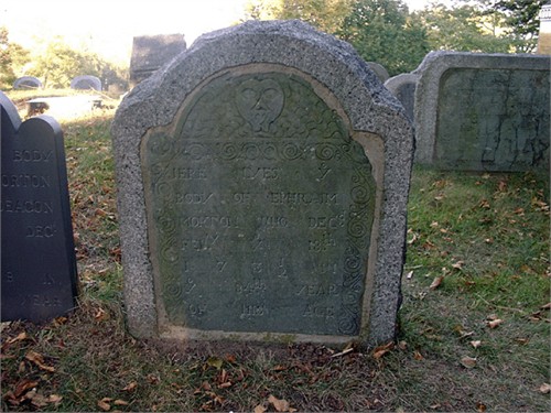 Epitaph – Here lyes ye body of Deacon George Morton who decd Augst ye 2d 1727 in ye 82d year of his age. Deacon George Morton was the son of Ephraim and Ann (Cooper) Morton , born 1645 , and grandson of George Morton who came in the Ann in 1623 , whose wife was Julian Carpenter of Wrentham, England , and married in Leyden in 1612 . Ephraim , the father, was born on the passage to this country and died in 1663 . No stone is said to mark the place of his burial, or that of his brother Nathaniel Morton , who was Secretary of the Colony, and died in 1685 , although he was probably buried near to Deacon Morton ‘s grave