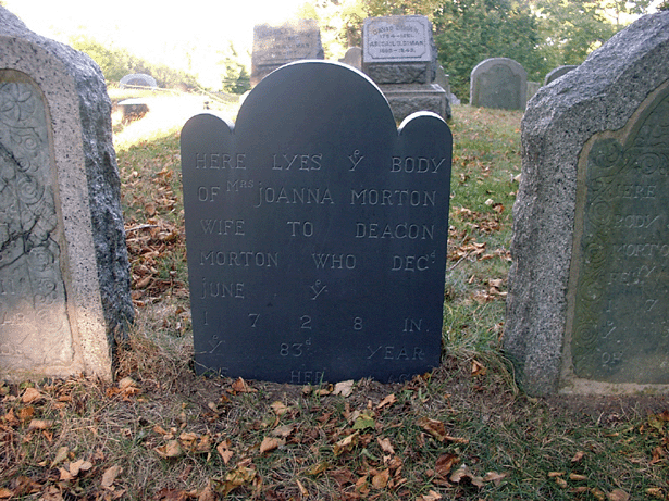 At the summit of Burial Hill, Plymouth, is a row of four stones of slate marking the graves of Deacon George Morton, his youngest son Thomas, his wife Joanna, and his brother Ephraim. Deacon George’s marker has been bound in granite to preserve it from the weather and to prevent pieces being chipped off by relic hunters.