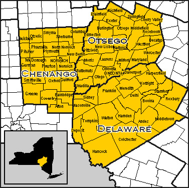 Colchester – was formed from Middletown, April 10, 1792. A part was annexed to Walton in 1799; Hancock was taken off in 1806, and a part of Walton was annexed in 1827. It occupies a central position upon the S.E. border of the co. Its surface is a mountainous upland, broken by the narrow valleys of the streams. The E. branch of the Delaware flows westward through the N. part of the town, dividing the highlands into two distinct parts. From the N. it receives West Trout, Downs, and Coles Brooks, and from the S. Clearwater and several smaller brooks. Beaver Kil flows through the S.W. corner, receiving Spring Brook as a tributary. The valleys of these streams are all narrow, and many hundred feet below the summits of the hills which rise on either side. The soil is a reddish clay, and is often very stony. A considerable share of the surface is still covered with forests. Lumbering is extensively pursued. Downsville, on the Delaware, at the mouth of Downs Creek, contains 3 churches. Pop 206. Pepacton and Colchester are p. offices. The first settlement was begun in May, 1774.** The first religious services (Bap.) were conducted by Elder Haynes, and the first church (Bap.) was formed in 1803.