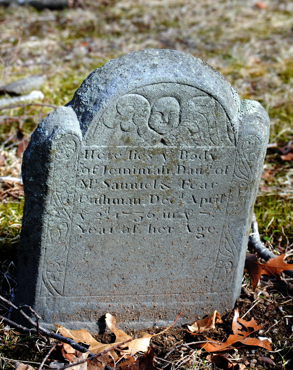 She was the second dau. named Jemima, latter b. and d. of record at age 3 at Plympton before the family’s move to Attleboro. Attleboro VRs: Jemima, d. Samuel & Fear, d. Apr. 2, 1736, in her 7th y. G.R. 13.